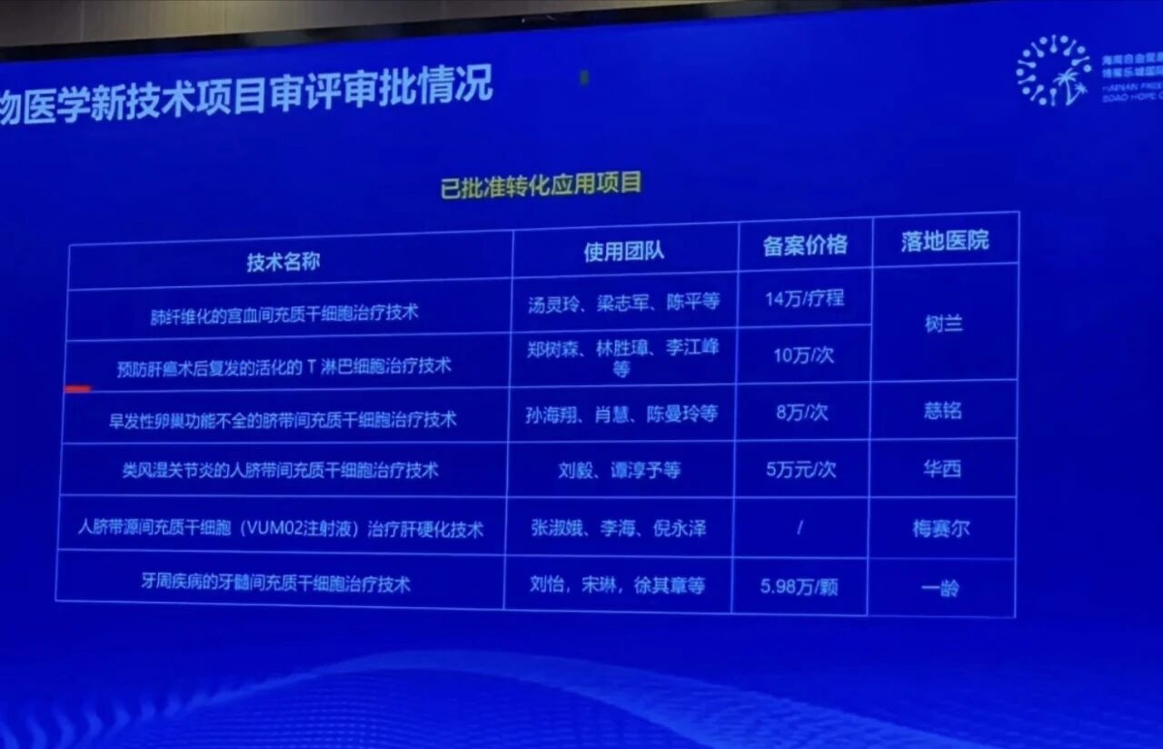 11月1日,海南博鳌乐城细胞年会2025年度盛典盛大举行,会上重磅公布了第四批细胞治疗项目的价格及落地医院信息,这一消息迅速引发医疗界和广大患者的广泛关注。此次共新增4个细胞治疗项目,具体价格及实施医院明细如下: