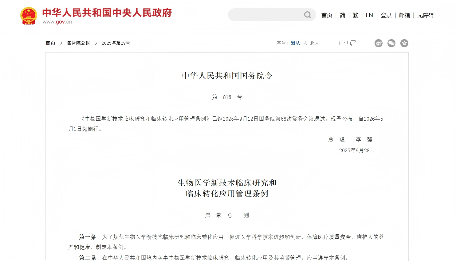 2025年,在多项国家政策利好的推动下,细胞治疗与再生医学领域迎来爆发式增长。其中,2025年9月28日国务院发布的《生物医学新技术临床研究和临床转化应用管理条例》(即“818条例”),成为行业发展的关键转折点。该条例明确细胞项目的准入与转化路径,为行业提供了清晰的政策指引,显著加速细胞技术从实验室走向临床的进程。