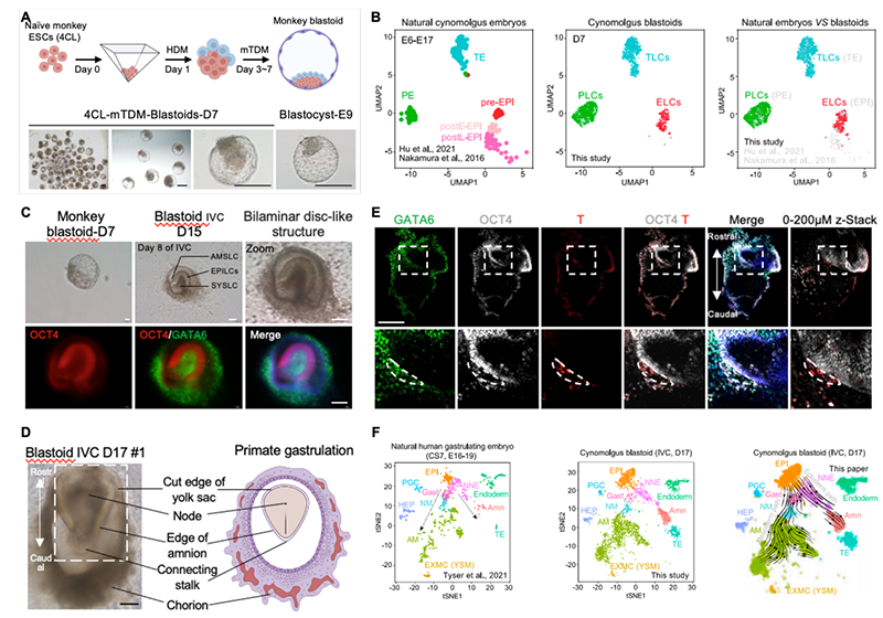 图1.(A)非人灵长类食蟹猴类囊胚体外重构。(B)scRNA-seq分析体外重构的非人灵长类食蟹猴类囊胚的细胞谱系构成。(C)非人灵长类食蟹猴类囊胚体外延迟培养至D15时形成的双层胚盘样结构。(D)非人灵长类食蟹猴类囊胚体外延迟培养至D17时形成的原肠胚样结构。(E)非人灵长类食蟹猴D17类胚胎的形态学染色。OCT4, EPI marker. GATA6, amine marker. T(Brachyury), gastrulation marker. (F)非人灵长类食蟹猴D17类胚胎的单细胞转录组分析和发育路径分析。