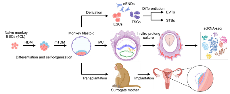 该研究利用胚胎干细胞建立了食蟹猴类囊胚诱导系统,体外培养食蟹猴类囊胚可诱导原肠运动的相关胚层,体内移植可以检测到早期妊娠囊的出现。