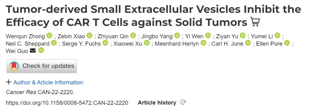近日,宾夕法尼亚大学郭巍教授课题组在 Cancer Research 期刊发表了题为:Tumor-derived Small Extracellular Vesicles Inhibit the Efficacy of CAR T Cells against Solid Tumors 的研究论文。