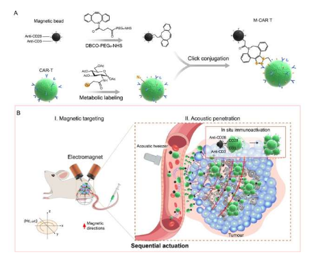 该研究开发的机器人具有磁—声顺序驱动功能,能通过使用单击共轭技术对CAR-T细胞装饰免疫磁珠,从而自主导航到肿瘤位点并进行相应的细胞免疫治疗。