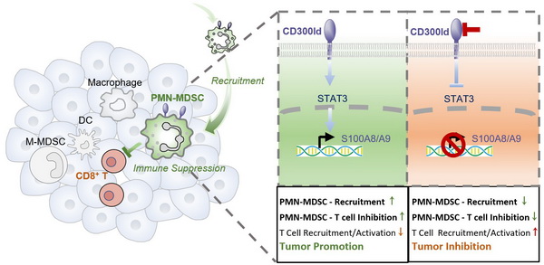 综上,该研究发现了PMN-MDSCs表面的关键功能受体CD300ld,在肿瘤免疫抑制中发挥重要作用。CD300ld通过STAT3-S100A8/A9轴同时调控PMN-MDSCs的募集及其T细胞抑制功能,从而促进免疫抑制微环境的建立和肿瘤的进展。阻断CD300ld通过减少PMN-MDSCs的募集并降低其免疫抑制功能,重塑免疫微环境由免疫抑制状态转为活化状态,从而产生广谱抗肿瘤效果。