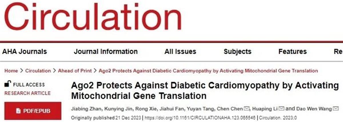 2023年12月,汪道文教授团队在《Circulation(循环)》杂志在线发表题为“Ago2 protects against diabetic cardiomyopathy via activating mitochondrial gene translation”的研究论文,团队深入研究糖尿病心肌损伤的发病机制,揭示了AGO2蛋白在糖尿病心肌病中的作用及机制,为糖尿病心肌病的发病及治疗提供了新思路。