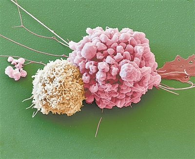 一个免疫细胞(左)与旁边的神经系统癌细胞。图片来源:《自然》网站